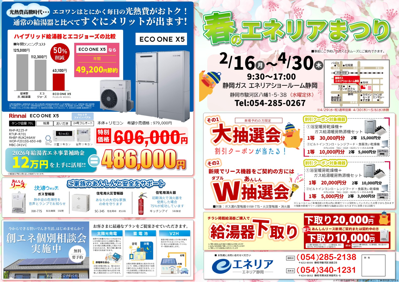 ■期間中、静岡ガス エネリアショールーム静岡へのご来場予約で割引クーポンが当たる大抽選会を開催!